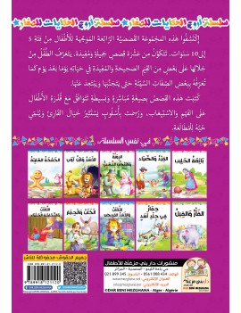إِكْتَشِفُوا هَذِهِ المَجْمُوعَة القَصَصَيَّة الرَّائِعَة المُوَجَّهَة لِلْأَطْفَال مِنْ فِئَةِ 5 – 10 سَنَوَات، تَتَكَوَّنُ مِن ثَمَانِيَة قِصَصٍ جَمِيلَةٍ وَمُفِيدَة، يَتَعَرَّفُ الطَّفْلُ مِنْ خِلَالِهَا عَلَى بَعْضٍ مِنَ القِيَمِ الصَحِيحَةِ وَالمُفِيدَةِ فِي حَيَاتِهِ يَوْمَا بَعْدَ يَوْم كَمَا تُعَرِّفُهُ بِبَعْضِ الصِّفَاتِ السَّيِّئَةِ حَتَى يَتَجَنَّبَهَا وَيَبْتَعِدَ عَنْهَا.